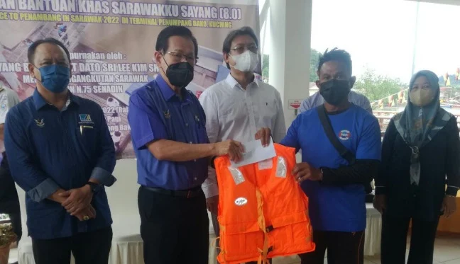 | Lee menyampaikan BKSS sebanyak RM500 kepada pengusaha bot di Terminal Bako hari ini. |