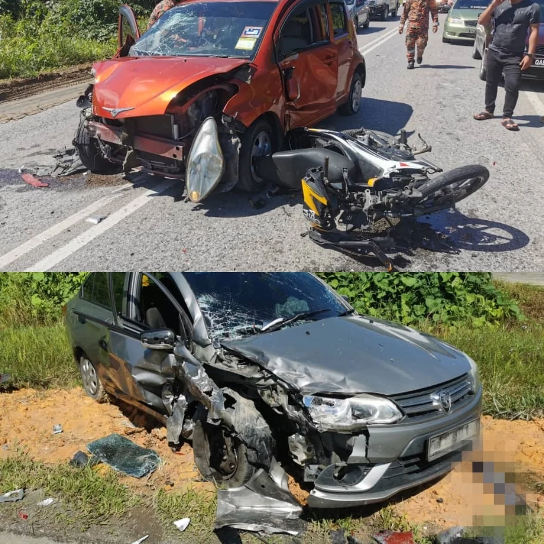 Dua kereta bertembung, penunggang motosikal cedera tercampak